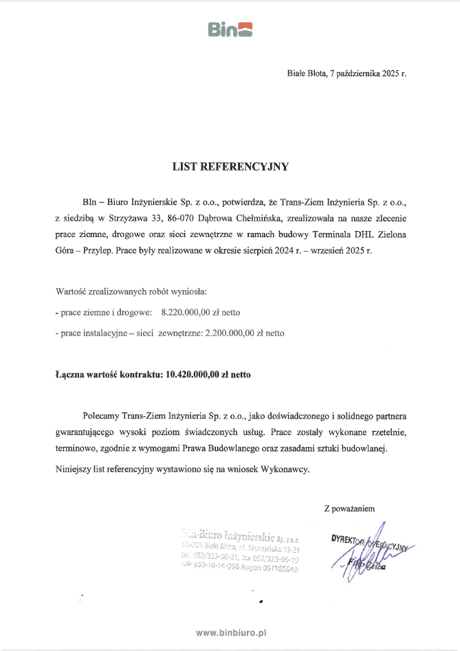 ŚWIADCZONE W SPOSÓB PROFESJONALNY USŁUGI KOPARKO-ŁADOWARKĄ OBEJMOWAŁY SZEREG PRAC ZIEMNYCH, KTÓRE ZREALIZOWALIŚMY NA TERENIE CAŁEGO KRAJU. ICH WYKONANIE ZOSTAŁO POZYTYWNIE OCENIONE PRZEZ NASZYCH KLIENTÓW. WIELU INWESTORÓW PRZYGOTOWAŁO LISTY REFERENCYJNE, KTÓRE PRZEDSTAWIAMY W FORMIE GALERII. SERDECZNIE ZAPRASZAMY DO ZAPOZNANIA SIĘ Z ICH TREŚCIĄ, A TAKŻE DO PODJĘCIA WSPÓŁPRACY – GWARANTUJEMY PEŁEN PROFESJONALIZM, TERMINOWOŚĆ I PRZYSTĘPNE CENY!